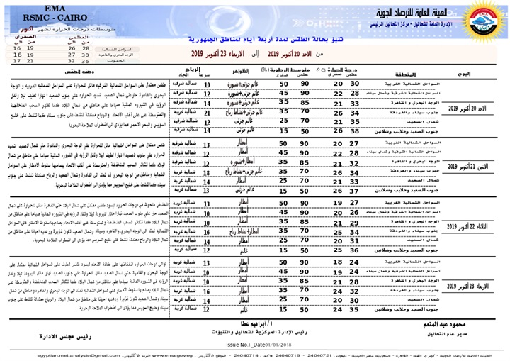 كشف الدكتور إبراهيم عطا، رئيس الإدارة المركزية للتنبؤات الجوية،عن تغيرات جديدة باحوال الطقس بالبلاد حيث تدخل في حالة من عدم الاستقرار في الطقس بدءا من اليوم الإثنين، وحتى يوم الجمعة المقبل.