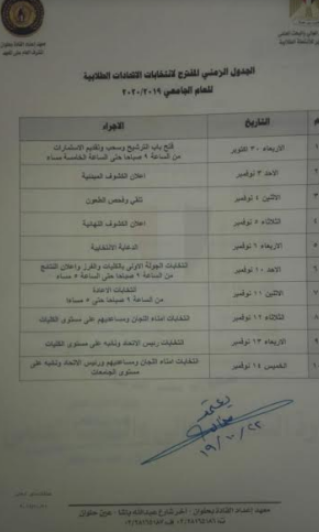 وافق د. خالد عبد الغفار وزير التعليم العالي والبحث العلمي على الجدول الزمنى لإجراء الانتخابات الطلابية للعام الجامعى 2019/2020.
