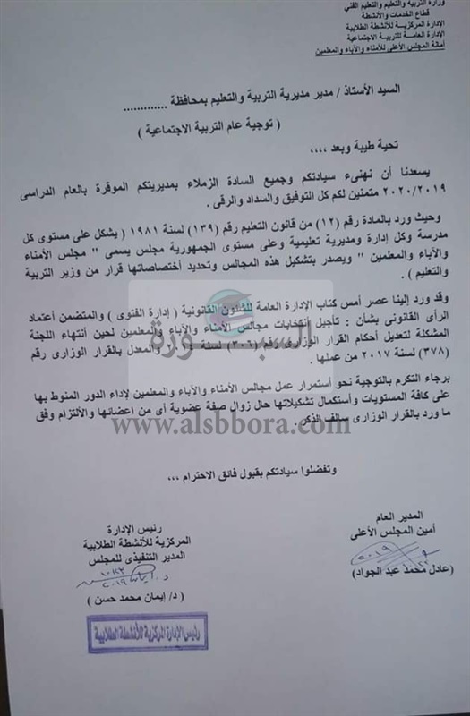 جاء فيه " برجاء التكرم بالتوجيه نحو استمرار عمل مجالس الامناء والاباء والمعلمين لاداء الدور المنوط بها على كافة المستويات واستكمال تشكيلاتها حال زوال صفة عضوية اى من اعضائها والالتزام وفق ما ورد بالقرار الوزارى سالف الذكر".