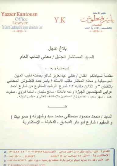 تقدم المستشار ياسر قنطوش المحامى بالنقض وكيلاً عن الفنان هاني شاكر بصفته نقيب المهن الموسيقية ببلاغ رسمي إلى المستشار حمادة الصاوي، النائب العام ضد المدعو محمد محمود مصطفي محمد سيد احمد وشهرته "حمو بيكا " يتهمه بالتحريض والتجمهر واقتحام مقر نقابة المهن الموسيقية ومعاودة اقتحامها مرة أخرى وتحطيم كافة محتوياتها .