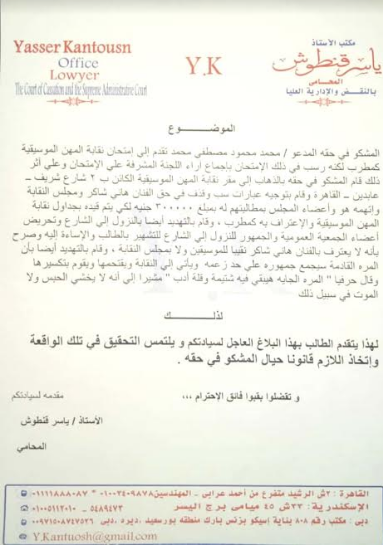 وإضاف قنطوش في عريضة بلاغه، أن المشكو في حقه بعد تقدمه لإختبار عضوية النقابة وتسديد الرسوم القانونية بإيصال رسمي، قررت لجنة الإختبارات بالنقابة عدم صلاحيته ورفض طلبه مما دعاه الافتراء على اللجنة بمطالبته بمبلغ مالي كبير لقبول عضويته، كما قام المشكو في حقه بمعاونة عدد من البلطجية باقتحام نقابة المهن الموسيقية وتوجيه عبارات السب والقذف تجاه الفنان هاني شاكر ومجلس النقابة والتوعد والتهديدات بإعادة اقتحامه لمقر النقابة مرة أخري بإعداد أكبر من معاونيه من البلطجية وتكسير وتحطيم محتوياتها بقوله " المرة الجاية هيبقي فيه شتيمة وقلة أدب " مشيراً إلى أنه لا يخشي الحبس ولا الموت في سبيل ذلك لذلك.