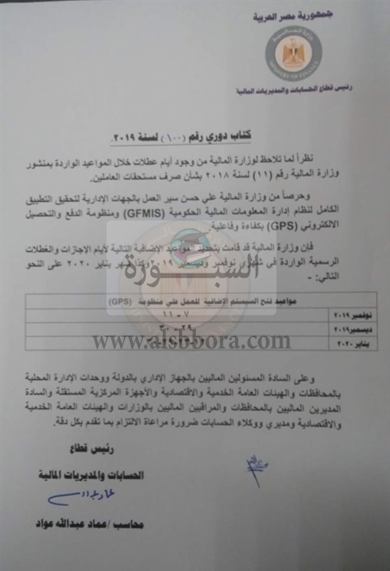 تنشر"السبورة" الكتاب الدورى 100 لسنة 2019 لوزارة المالية الذي تضمن تعليمات جديدة لمديرى الحسابات بجميع المصالح الحكومية بشأن مواعيد الدفع والتحصيل الالكتروني لشهر نوفمبر وديسمبر 2019 ويناير 2020