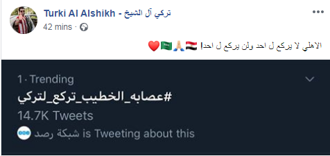 قام تركي آل الشيخ رئيس هيئة الترفيه في المملكة العربية السعودية،بتوجية رسالة جديدة بعد اطلاق هاشتاج "عصابة الخطيب تركع لتركى"