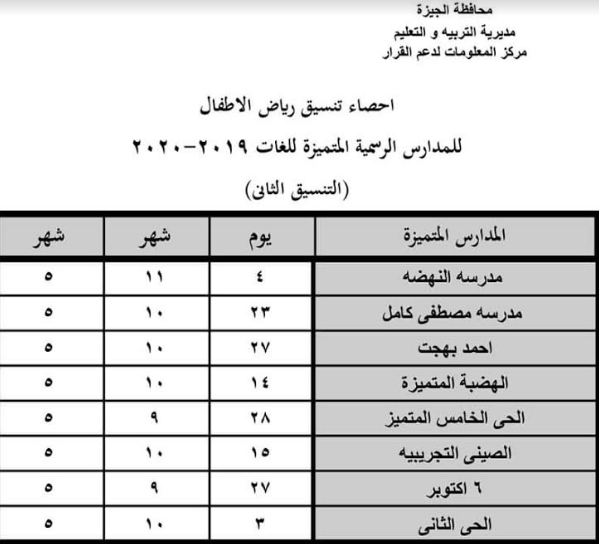 اعلنت مديربه تعليم الجيزه تيجة التنسيق الثانى للمرحلة الاولى لرياض الاطفال للمدارس الرسمية المتميزة للغات للعام الدراسى 2019 2020