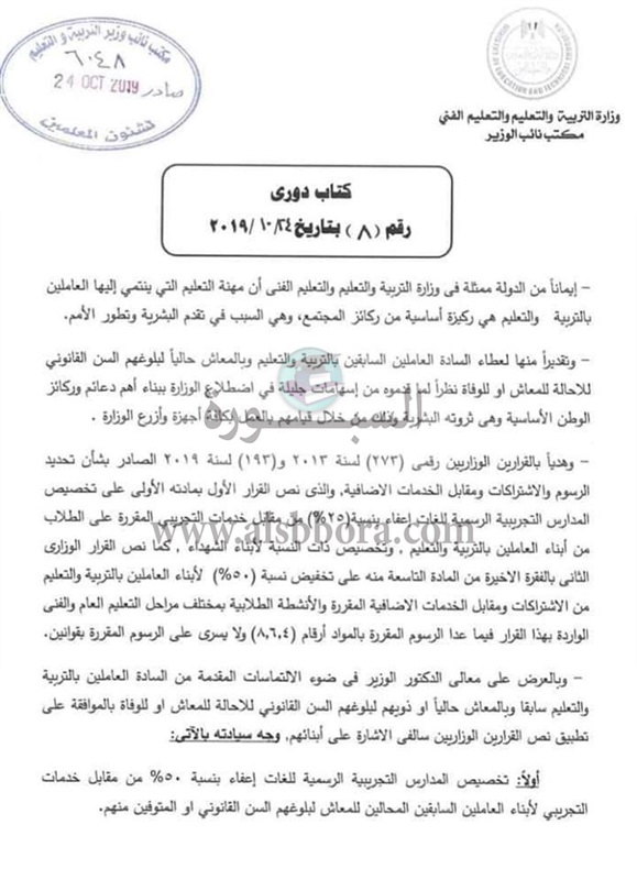 اصدرت وزارة التربية والتعليم والتعليم الفنى كتابا دوريا رقم 8 بتاريخ 24 اكتوبر 2019، بشأن هؤلاء المعلمين وخصم نسبة من المصروفات الدراسية، والتى تصل الى 50%.