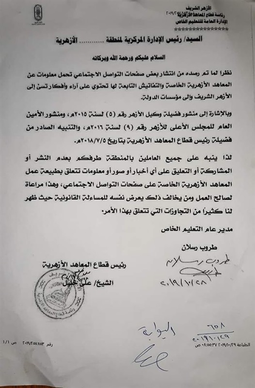 اصدر قطاع المعاهد الازهرية تحذيرا شديدا لجميع العاملين بجميع المناطق الأزهرية ومعاهدها، والذى يقضى بعدم نشر أو مشاركة أو التعليق علي أخبار او صور او معلومات علي صفحات التواصل الاجتماعي ومن يخالف ذلك يعرض نفسه للمسائلة القانونيه .