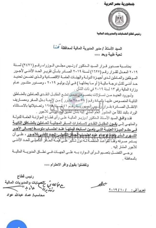 واضافت الوزارة فى فاكسا لها تم توزيعه على جميع الادارات المالية فى المحافظات والهيئات والمصالح الحكومية، على ان يكون المقابل النقدى لاستمارات السفر المجانية للعاملين بالمناطق النائية فى حكم الميزة العينية التى يتعين استبعاد قيمتها عند احتساب متوسط اجمالى الاجر الشهرى الذى يتخذ كوعاء عند احتساب الحافز التكميلى للحد الادنى للأجور، على ان يستمر صرفه وفقا للقواعد المنظمة له دون تأثير على قيمة الحافز التكميلى للحد الادنى للأجور المشار اليه.