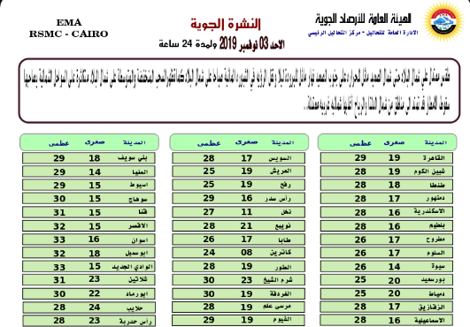 وتقل الرؤية في الشبورة المائية صباحا على شمال البلاد، كما تظهر السحب المنخفضة والمتوسطة على شمال البلاد متكاثرة على السواحل الشمالية يصاحبها سقوط الأمطار التى قد تمتد إلى مناطق من شمال الدلتا، والرياح أغلبها شمالية غربية معتدلة.