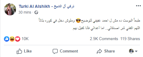 وكتب تركي آل الشيخ عبر حسابه الرسمي بموقع التواصل الاجتماعي "فيس بوك": " طبعًا البوست ده مش ل احمد عفيفي لتوضيح😎 وملوش دخل في كوره بتاتًا".