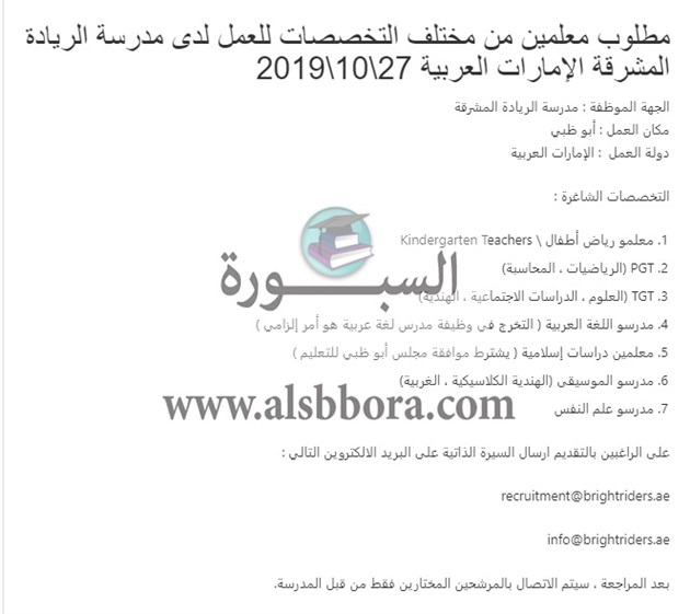 تعلن مدارس الريادة الإماراتية عن وظائف جديدة للمعلمين والمعلمات وذلك وفقا لنص الإعلان التالي:
