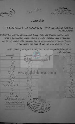 قامت مدرسة السعيدية بفصل نهائي للطلبة المتغيبين عن حصة التربية الرياضية ونشر أسمائهم على مواقع التواصل الاجتماعي .