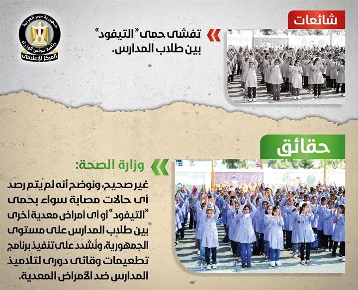 كشف مركز المعلومات بمجلس الوزراء عن صحة الاخبار المتداولة بشأن تفشى حمى التيفود بين طلاب المدارس.