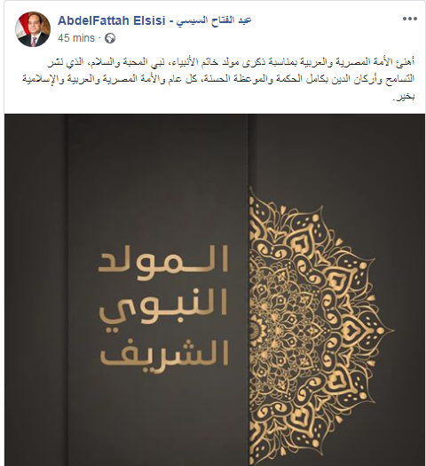 وكتب الرئيس السيسى على صفحته الرسمية بموقع التواصل الاجتماعى "فيس بوك": "أهنئ الأمة المصرية والعربية بمناسبة ذكرى مولد خاتم الأنبياء، نبي المحبة والسلام، الذى نشر التسامح وأركان الدين بكامل الحكمة والموعظة الحسنة، كل عام والأمة المصرية والعربية والإسلامية بخير".