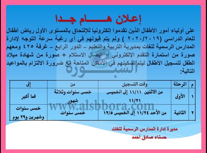 التعليم تشدد على حضور اولياء امور المتقدمين الكترونيا لالتحاق اولادهم بالمستوى الاول رياض الاطفال للمدارس الرسمية لغات 2020/2019.. ننشر المستندات المطلوبة