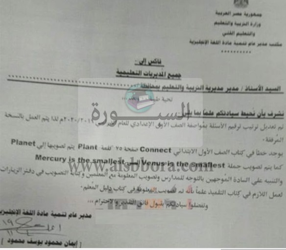 ارسلت وزارة التربية والتعليم والتعليم الفنى فاكسا الى جميع المديريات التعليمية بشأن تصحيح خطأ فى كتاب الصف الاول ا لابتدائى "connect"، حيث جاء التصحيح من خلال الفاكس التالى: