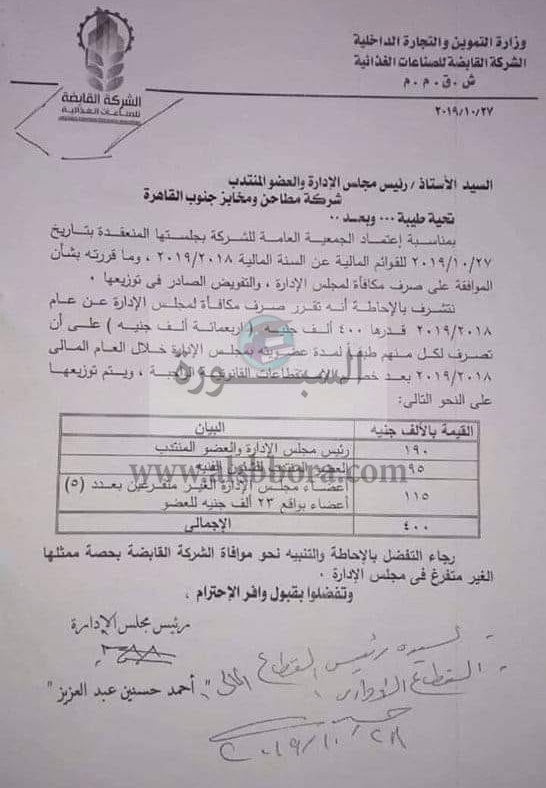 صرف 190 الف جنيه مكافأة رئيس مجلس ادارة مطاحن ومخابز جنوب القاهرة.. مستند