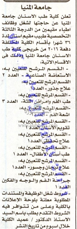 تعلن جامعة المنيا عن حاجتها الى اعضاء هيئة التدريس ومعاونيهم، وعلى الراغبين فى الحصول على الوظيفة التقدم بطلب باسم الدكتور عميد الكلية خلال اسبوع من تاريخ نشر الاعلان فى جريدة الاخبار امس الخميس الموافق 14 نوفمبر 2019.