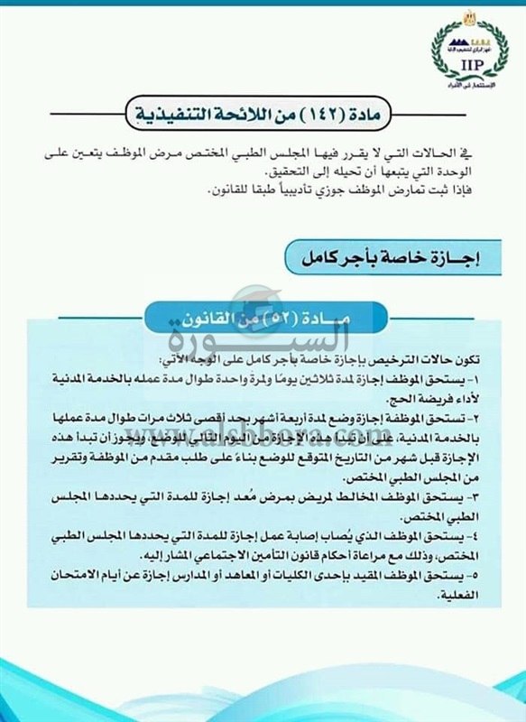 ينشر موقع السبورة 5 انواع من الاجازات الوجوبية الذى كفلها الدستور ومن خلال المادة 142 من اللائحة التنفيذية والتى جاءت كالتالى: