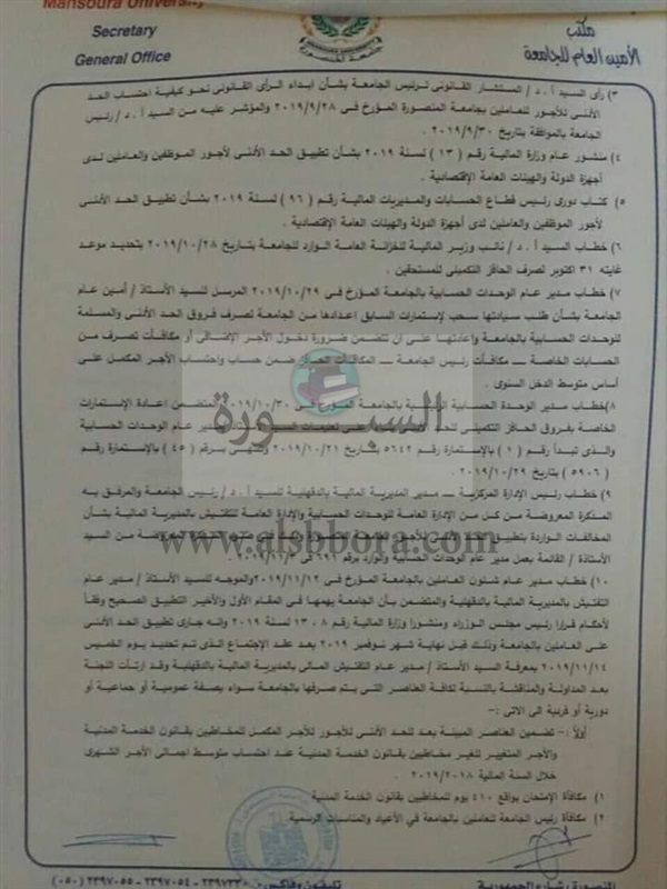 نشر نشطاء التعليم بموقع التواصل الاجتماعى "فيسبوك" مستندات تثبت بان جامعة المنصورة قامت بتطبيق الحد الادنى بدون الاجر الاضافى ومكافأت الامتحانات.