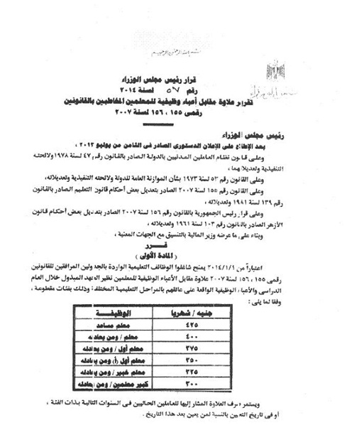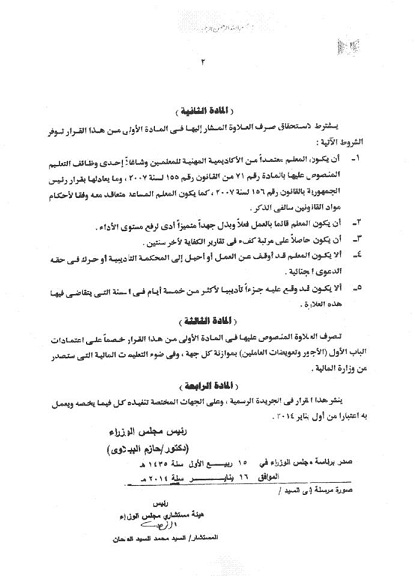 وينص القرار في مادته الثانية على أنه يشترط لاستحقاق صرف العلاوة المشار إليها في المادة الأولى توفر الشروط الآتية: أن يكون المعلم معتمدًا من الأكاديمية المهنية للمعلمين وشاغلاً إحدى وظائف التعليم المنصوص عليها بالمادة رقم 71 من القانون رقم 155 لسنة 2007، وما يعادلها بقرار رئيس الجمهورية بالقانون رقم 156 لسنة 2007، كما يكون المعلم المساعد متعاقد معه وفقا لأحكام مواد القانونين سالفي الذكر.