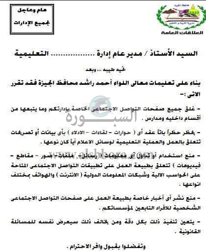 عاجل| غلق جميع صفحات التواصل الاجتماعى بالمدارس بمحافظة الجيزه.. مستند