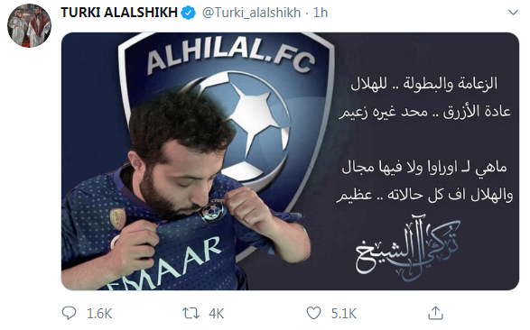 وكتب تركي آل الشيخ تغريدة على تويتر قال فيها: "الزعامة والبطولة.. للهلال عادة الأزرق.. محد غيره زعيم.. ما هي لـ اوراوا ولا فيها مجال والهلال اف كل حالاته.. عظيم".