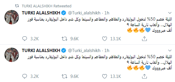 وأضاف تركي آل الشيخ: "الليلة خصم 50% لدخول البوليفارد والمقاهي والمطاعم والسينما وكل شي داخل البوليفارد بمناسبة فوز الهلال... وألعاب نارية الساعة ٩ ألف مبروووك.. انتقلت إلى رحمة الله.. العالمية صعبة قوية".