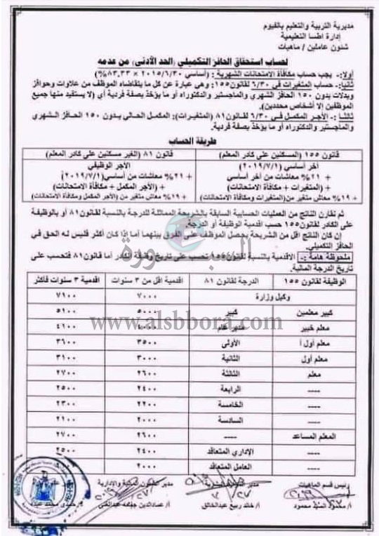 ارسلت مديرية التربية والتعليم بمحافظة الفيوم فاكسا معمما الى جميع اقسام الماهيات والحسابات بالادارات التعليمية بشأن كيفية احتساب الحد الادنى للأجور للخاضعين لقانون 155 لسنة 2007، والخاضعين لقانون 81 للمعلمين غير المسكنين على الكادر.
