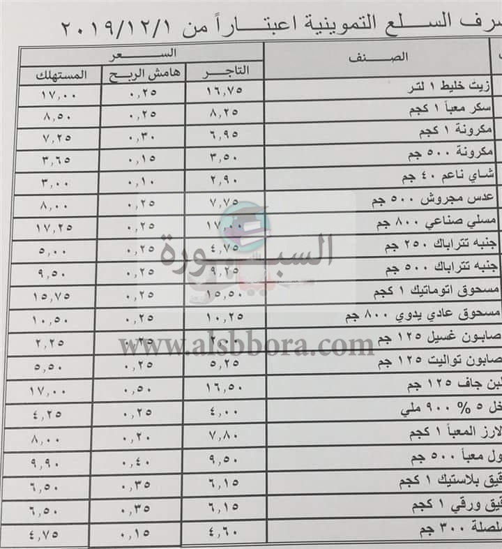 اعلنت وزارة التموين والتجارة الداخلية عن اسعار السلع المدعمة والتى يتم صرفها من خلال بطاقات التموين بداية من شهر ديسمبر المقبل، حيث جاءت قائمة الاسعار كالتالى: