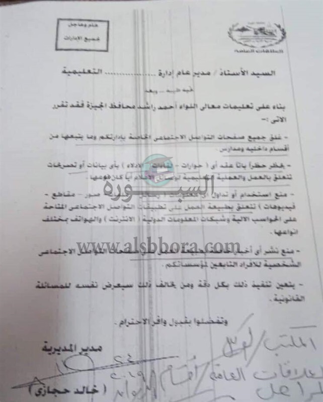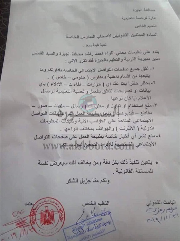 فرمان رسمى..غلق صفحات التواصل الاجتماعى للمدارس الحكومية والخاصة والاقتراب من وسائل الاعلام ممنوع..مستند