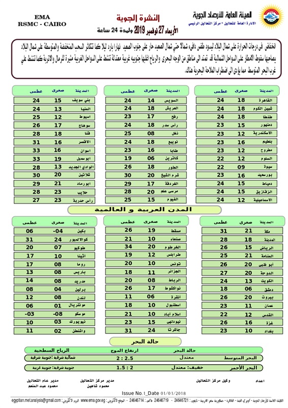 كما تتكاثر السحب المنخفضة والمتوسطة على شمال البلاد يصاحبها سقوط الأمطار على السواحل الشمالية قد تمتد لمناطق من الوجه البحرى، والرياح أغلبها جنوبية غربية تنشط على السواحل الغربية تكون مثيرة للرمال والأتربة على بعض المناطق، كما تنشط على غرب البحر المتوسط ما يؤدى إلى اضطراب الملاحة البحرية هناك.