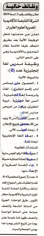 تعلن الشركة القابضة للاكاديمية المصرية لعلوم الطيران عن حاجتها الى اعضاء هيئة التدريس، وعلى الراغين فى الحصول على الوظيفة تقديم الطلبات على النموذج المعد لذلك بالادارة العامة لتنمية الموارد البشرية بالاكاديمية على العنوان المنشور فى جريدة الاهرام اليوم الجمعة الموافق 29 نوفمبر 2019، خلال اسبوعين من تاريخ نشر الاعلان، ماعدا يومى الجمعة والسبت.