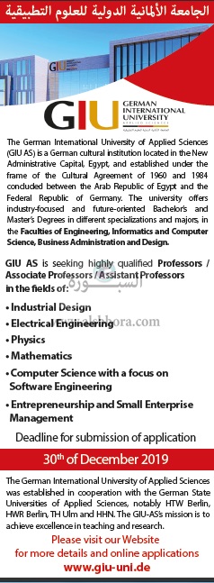 اعلنت الجامعة الالمانية الدولية للعلوم التطبيقية بالقاهرة " " GIUعن حاجتها لوظائف اعضاء هئية التدريس فى العديد من التخصصات