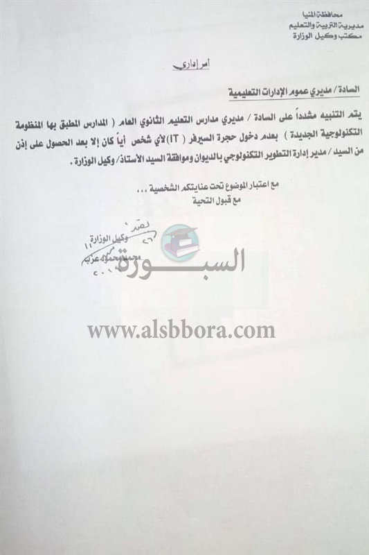 أصدرت مديرية التربية والتعليم بالمنيا أمراً إدارياً، شددت خلاله على ضرورة التنبيه على مديري مدارس التعليم الثانوى العام /المدارس المطبق بها المنظومة التكنولوجية الجديدة بعدم دخول حجرة السيرفر IT لأي شخص إلا بعد الحصول على إذن من مدير التطوير التكنولوجي وموافقة وكيل الوزارة.