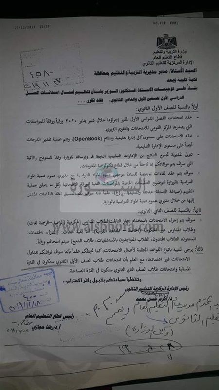ونص الخطاب، أنه بالنسبة للصف الأول الثانوي، سيتم عقد امتحانات الفصل الدراسي الأول المقرر إجراؤها خلال شهر يناير 2020 ورقياً ووفقاً للمواصفات التي يصدرها المركز القومي للامتحانات والتقويم التربوي، وتعقد الامتحانات على مستوى كل إدارة تعليمية وبنظام (Open Book)، وتتم عملية تقدير الدرجات أيضاً على مستوى الإدارة التعليمية.