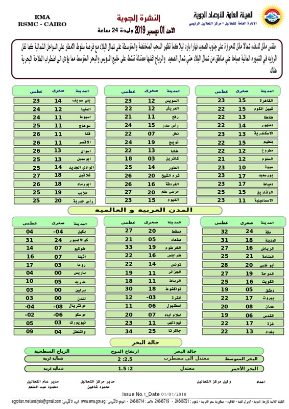 كشف خبراء هيئة الأرصاد الجوية عن حالة الطقس اليوم الأحد،حيث من المتوقع ان يسود طقس مائل للدفء شمالا مائل للحرارة على جنوب الصعيد نهارا بارد ليلا، كما تظهر السحب المنخفضة والمتوسطة على شمال البلاد مع فرصة لسقوط الأمطار على السواحل الشمالية.