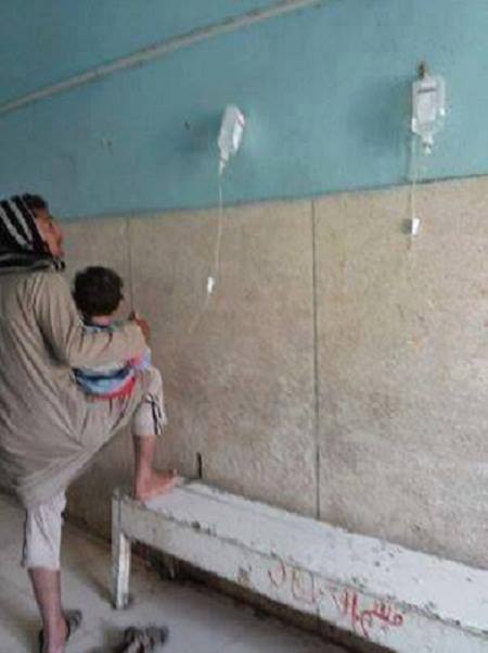 تحولت طرقات مستشفي أبو الريش الياباني للاطفال التابعة لجامعة القاهرة إلي ساحة لتلقي العلاج من المرضي الاطفال بدلا من الغرف ،واستخدم الاطباء الحوائط و"الحوامل المتحركة" لتعليق المحاليل عليها للاطفال،وفي الصورة سيدة تجلس في إحدي الطرقات المخصصة للانتظار وهي تضع طفلها علي رجليها ،ليتلقي المحاليل بشكل غير ادمي.