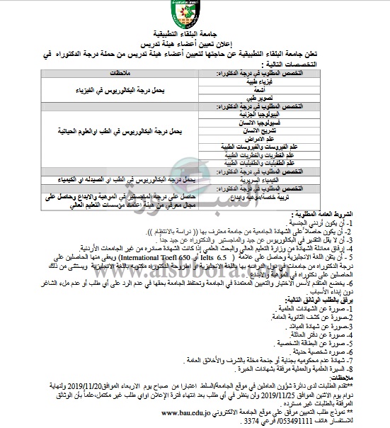 تعلن جامعة البلقاء عن وظائف جديدة لأعضاء هيئة التدريس في 10 تخصصات "من معيد إلي أستاذ" وذلك وفقا لنص الإعلان التالي:-
