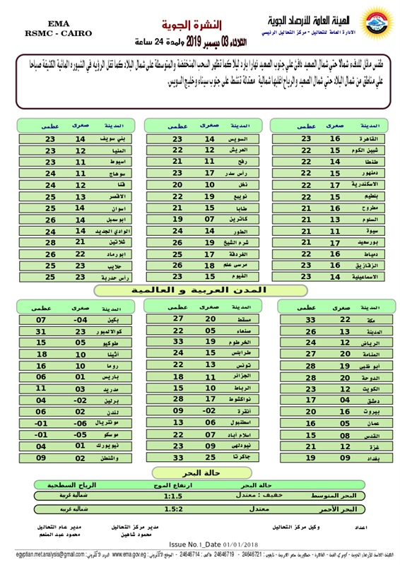 أعلنت هيئة الأرصاد الجوية، عن طقس اليوم الثلاثاء 3 ديسمبر 2019، ليسود طقس مائل للدفء شمالا حتى شمال الصعيد، دافئ على باقى الأنحاء نهارا، بارد ليلا.