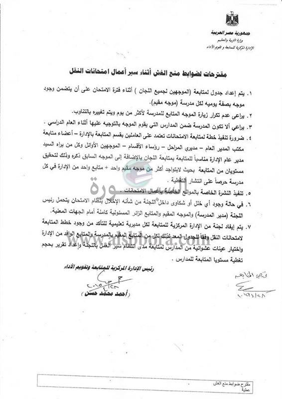 اعلنت الادارة المركزية للمتابعة وتقويم الاداء بوزارة التربية والتعليم والتعليم الفنى عن ضوابط منع العش اثناء سير اعمال امتحانات النقل للعام الدراسى 2020/2019، والتى جاءت كالتالى: