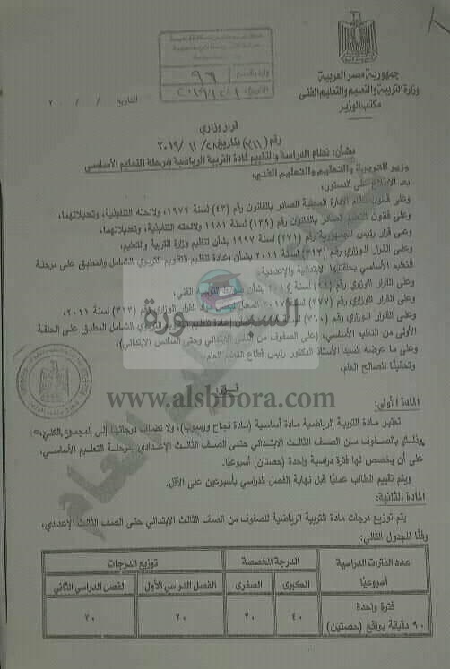 اصدر الدكتور طارق شوقى، وزير التربية والتعليم قرارا وزاريا بشأن مادة التربية الرياضية واحتسابها كمادة نجاح ورسوب بدء من الصف الثالث الابتدائى الى الصف الثالث الاعدادى، على ان يتم احتساب هذه المادة بداية من العام الدراسى الحالى 2020/2019.