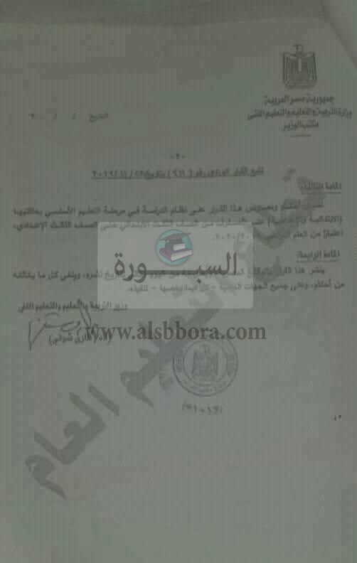 واضاف القرار الوزارى انها لا تضاف الى المجموع، على ان تكون من 40 درجة يتم احتساب 20 درجة فى امتحانات التيرم الاول، و20 درجة اخرى على التيرم الثانى.