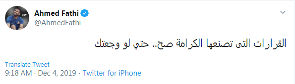 وكتب أحمد فتحي صباح اليوم الأربعاء عبر حسابه الرسمي بموقع التواصل الاجتماعي "تويتر": "القرارات التي تصنعها الكرامة صح.. حتى لو وجعتك".