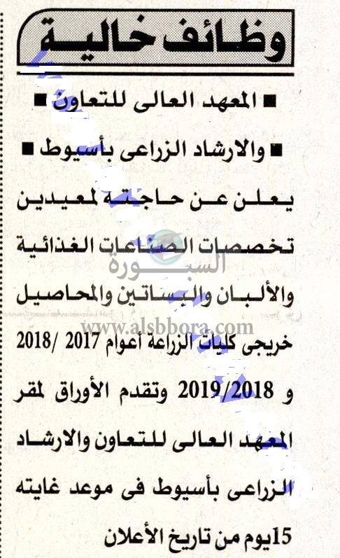 يعلن المعهد العالى للتعاون والارشاد الزراعى باسيوط عن حاجته الى معيدين، وعلى الراغبين فى الحصول على الوظيفة تقديم الاوراق بمقر المعهد على العنوان المنشور فى جريدة الاهرام اليوم الاريعاء الموافق 4 ديسمبر 2019، خلال 15 يوما من تاريخ نشر الاعلان.