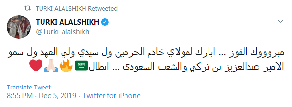 وكتب تركي آل الشيخ، عبر صفحتة الرسمية على مواقع التواصل الإجتماعى" تويتر " قائلا : " مبروووك الفوز ... ابارك لمولاي خادم الحرمين ولسيدي ولي العهد ولسمو الامير عبدالعزيز بن تركي والشعب السعودي ... ابطال".