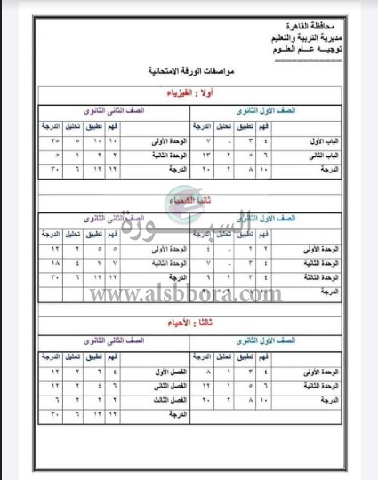 اعلنت وزارة التربية والتعليم مواصفات الورقة الامتحانية للكيمياء والفيزياء والاحياء للتيرم الاول للصفين الاول والثانى الثانوى العام للعام الدراسى 2020/2019، والتى جاءت كالتالى: