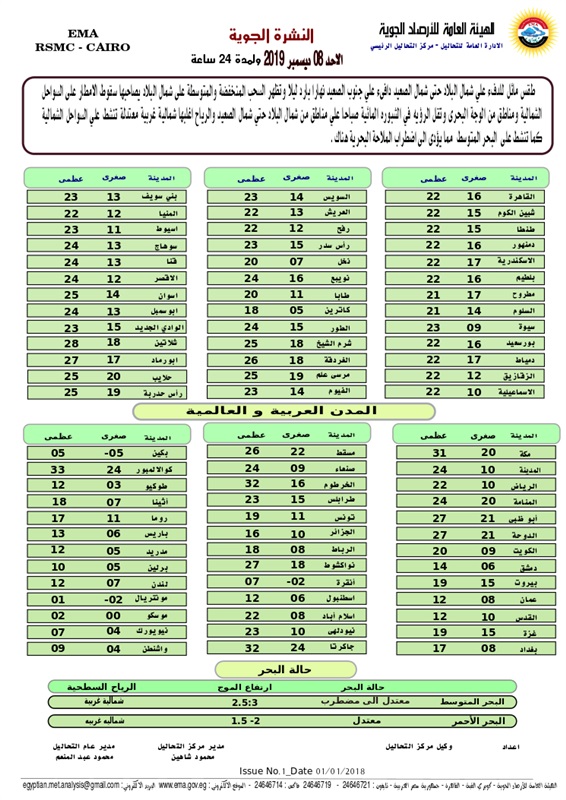 وبالنسبة لحالة البحر المتوسط فتكون معتدلة إلى مضطرب وارتفاع الموج فيه من مترين ونصف إلى ثلاثة أمتار والرياح السطحية شمالية غربية.. أما بالنسبة لحالة البحر الأحمر فتكون معتدلة وارتفاع الموج فيه من متر ونصف إلى مترين والرياح السطحية شمالية غربية