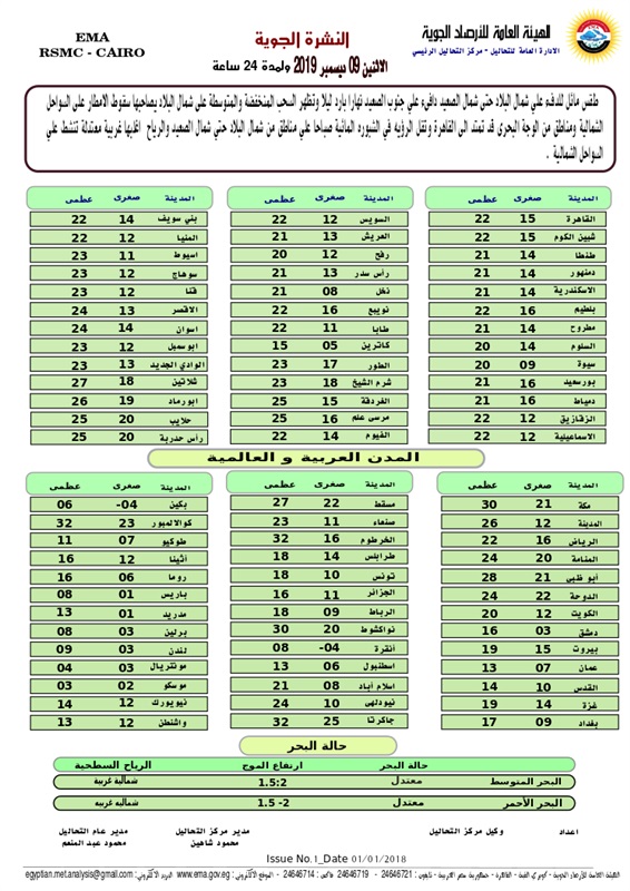 كما يتوقع الخبراء، أن تظهر السحب المنخفضة والمتوسطة على شمال البلاد يصاحبها سقوط الأمطار على السواحل الشمالية، ومناطق من الوجه البحرى، قد تمتد إلى القاهرة وتقل الرؤية فى الشبورة المائية صباحا على مناطق من شمال البلاد حتى شمال الصعيد، والرياح أغلبها غربية معتدلة تنشط على السواحل الشمالية.