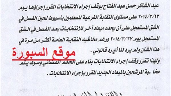 من جانبه أضاف عبد النعيم طه القائم بعمل أمين عام النقابة الفرعية أنه استلم منطوق حكم محكمة القضاء الادارى باسيوط فى الدعوى رقم 5371 لسنة 25 ق والتى قضت بجلسة 22/1/2014 تأجيل انتخابات التجديد النصفى لحين الفصل فى الشق المستعجل. كانت محكمة القضاء اA273;داري بأسيوط قد قضت بوقف انتخابات التجديد النصفي للجان النقابية على مستوى محافظة أسيوط، والتي كان من المقرر إجراءها في 13 فبراير الجاري، بناءً على الدعوى رقم رقم 5371 لسنة 25 ق المقامة من عبد الشاكر حسن عبد الفتاح، مدير إدارة الغنايم التعليمية السابق “بالمعاش”، وبعد حصوله على حكم قضائي ببطلان الكتب الدورية اA271;ربعة، والتي من بين بنودها إجراء انتخابات التجديد النصفي للنقابة على مستوى المحافظة ووقف الانتخابات؛ لحين الفصل في الشق المستعجل والذي تم تحديد جلسة له بتاريخ 27 مارس المقبل.