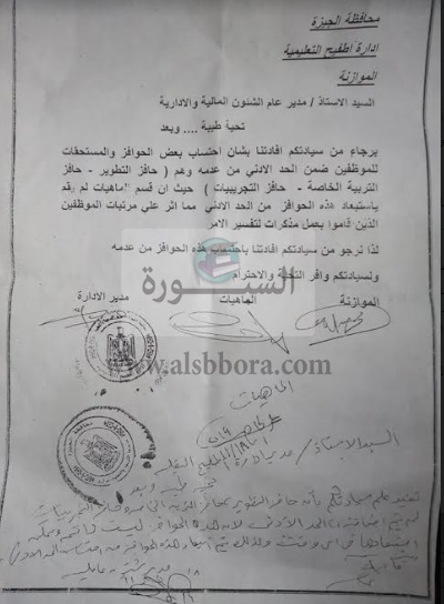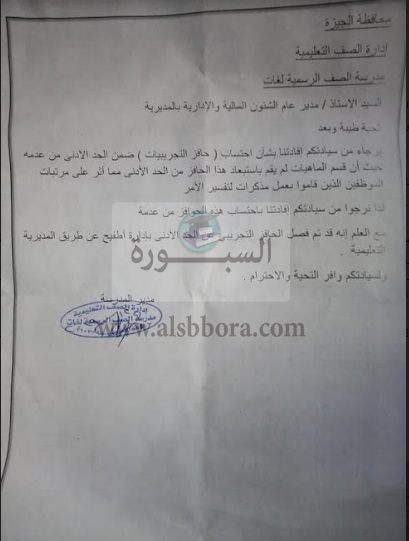 معلمو التجريبيات بالصف : الادارة أضافت حافز التجريبيات على الحد الادنى مخالفة للقانون فقلل من راتبنا.. مستند